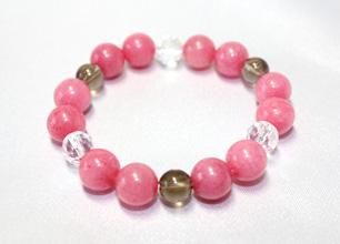 スモーキークオーツ(8mm)×3 精神の安定/マイナス思考をポジティブに変換/身体の癒し/恐怖・不安の解消 ピンク染クオーツァイト(10mm)×12 調和してより大きな力へ転換 64面カット水晶(8mm)×3 浄化/魔除け/パワーアップ サイズ:16cm